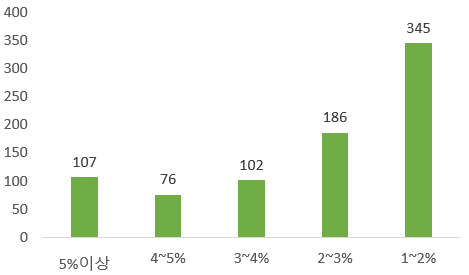 그리고 은행예금금리보다 높은 1%~2% 배당수익률 영역에 있는 종목 수는 345종목, 2~3%는 186종목, 3~4%는 102종목 그리고 2000년대 금리 수준인 4%~5%영역대는 76종목 그리고 5%이상 배당수익률인 종목은 100종목 이상입니다.