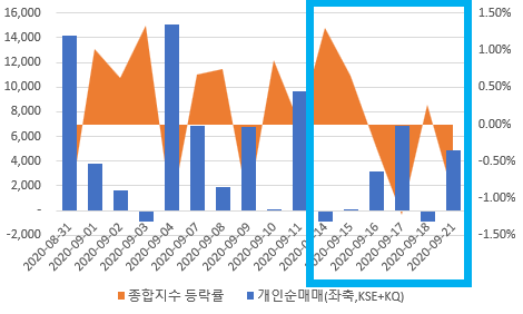 1조원 단위의 순매수를 가볍게 쏘아대던 개인투자자의 매수세가 9월 중순을 기점으로 많이 약해졌습니다.