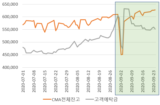 그런데, 9월 7일 이후 고객예각금과 CMA잔고는 전혀 다른 과정을 밟게 됩니다.