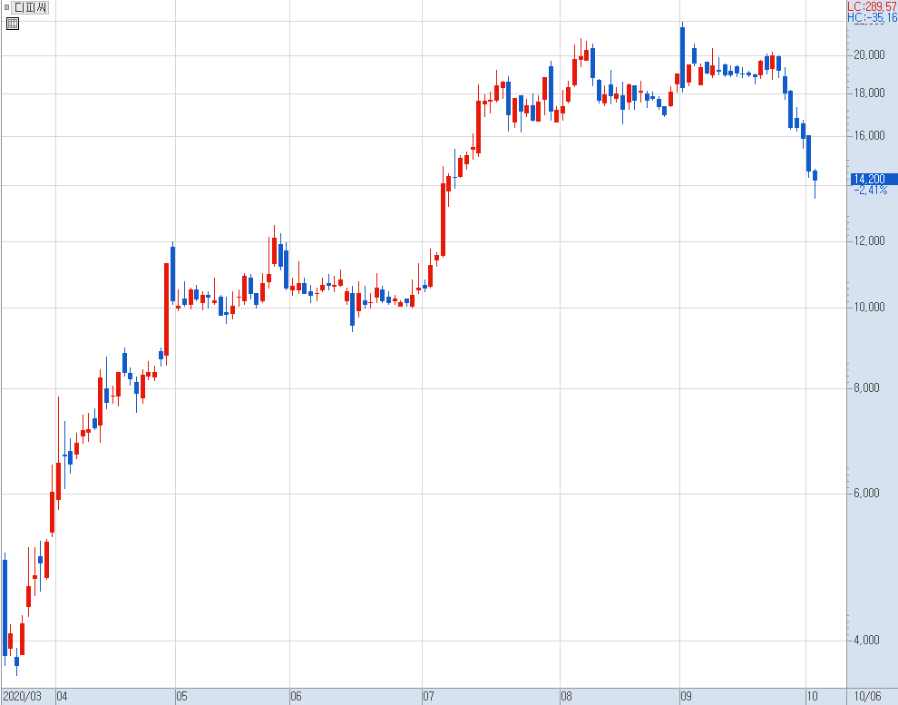 [빅히트 관련주인 디피씨의 주가흐름 3월 이후 5배 상승하였지만]