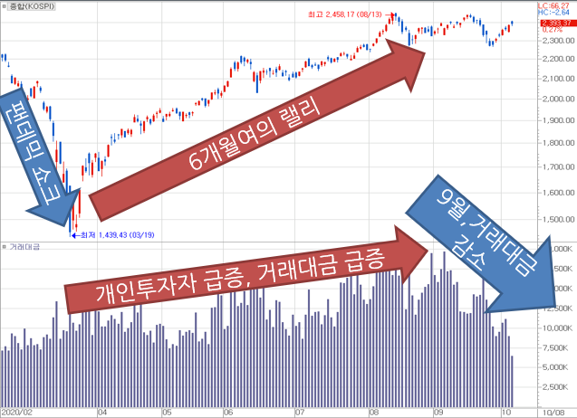 지난 3월 팬데믹 쇼크 이후 9월까지 증시 반등은 그야말로 드라마틱하였습니다. 최근 10년 내, 2010년대에는 볼 수 없었던 급등락이 1년도 안되는 시간에 벌어지는 가운데, 지난 3월 급반등 이후 여름 장세까지 신나게 달렸던 개인투자자들이 지쳐가는 모습들이 증시에서 나타나고 있습니다.