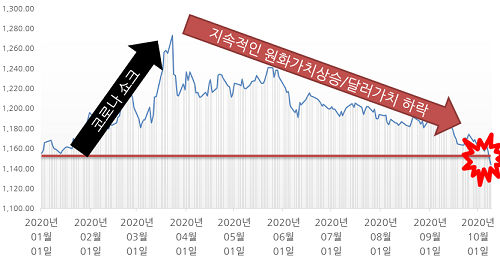 3월 19일 이후 10월 9일까지 달러원 환율은 -9.2%하락하였습니다. 이는 반대로 달러기준 원화가치가 대략 10%상승하였음을 의미합니다.