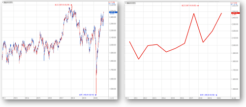 하지만 우측 차트처럼 연단위로 주가지수를 보면 그저 담담하지요. 그저 올해 주가지수가 많이 올랐구나로 보일 뿐입니다.