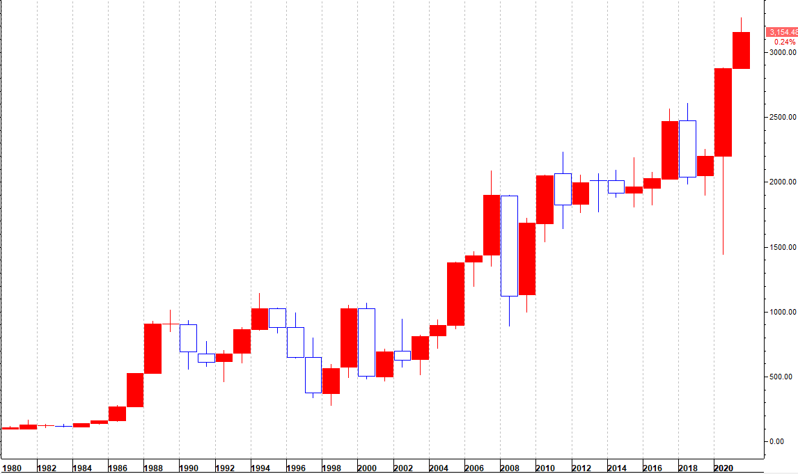 한국 종합주가지수는 1980년 연초 주가지수 100p로 시작하여 2021년 2월 현재 주가지수 3,150p 영역까지 약 41 여년 동안 31.5배 상승하였습니다. 연 환산으로 치자면 대략 연 8.8% 복리 수익률을 기록한 것이지요. (이 수치에는 배당수익률은 제외하도록 하겠습니다.)