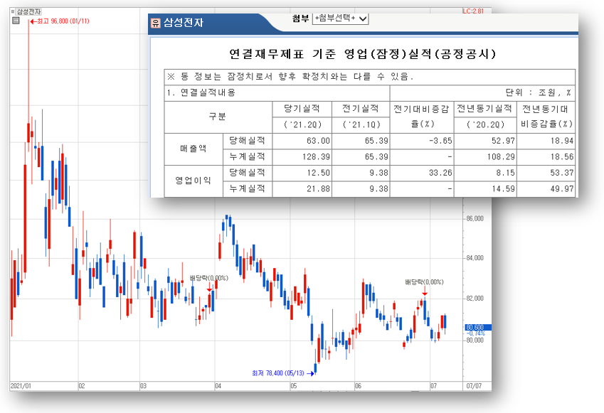 삼성전자의 2분기 어닝서프라이즈 소식이 아침부터 울려 퍼졌습니다. 매출액 전년동기비 18.94% 증가한 63조 원, 영업이익은 53.37% 증가한 12조 5천억 원을 기록하였습니다. 시장에서 예상한 영업이익 11조 원 수준을 껑충 뛰어넘는 수준이었지요. 하지만 삼성전자의 주가는 오늘 장중 –1% 넘게 하락하기도 하는 등 아쉬운 흐름을 만들고 있습니다. 그렇다고 해서 올해 4~6월 사이에 주가가 크게 오른 것도 아닌데도 말입니다.