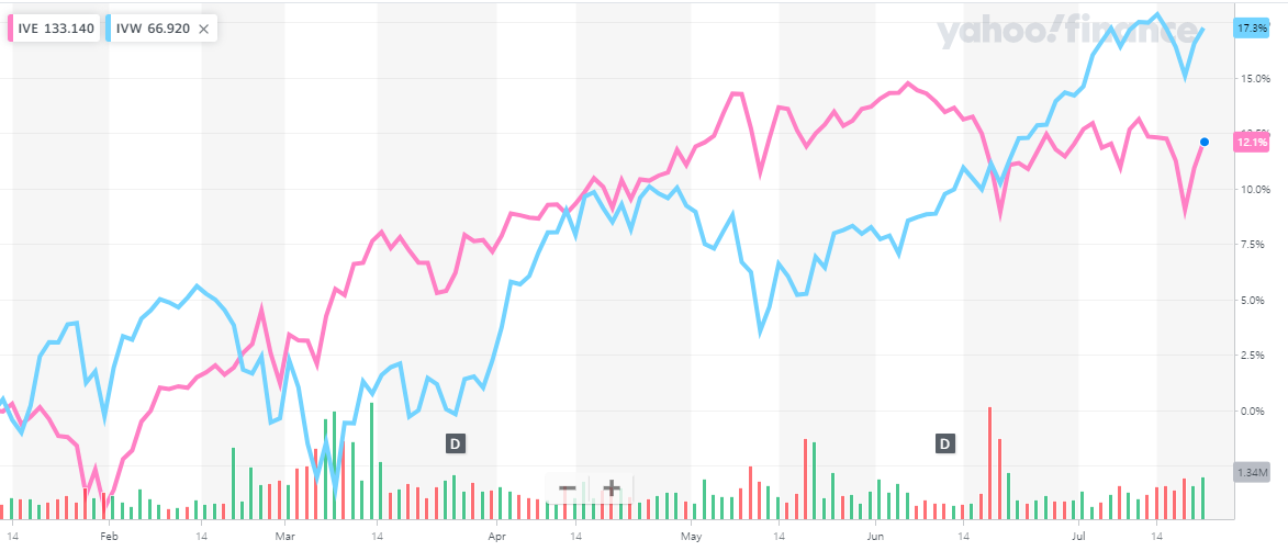 [ 올해 미국 가치주ETF IVE와 성장주ETF IVW의 상대 등락률 추이, 자료 : 야후 파이낸스 ]