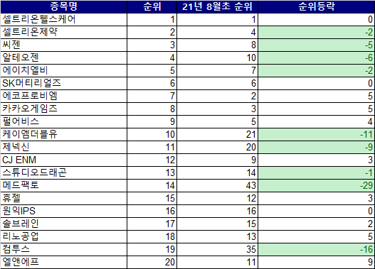 총 52개 종목이 시가총액 순위 상승이 있었고, 10위 이상 상승한 종목은 31종목, 20위 이상 순위가 상승한 종목은 26개에 이를 정도로 코스닥 시장 시가총액 최상위 종목 순위는 완전히 다른 업종, 다른 종목, 다른 스타일로 바뀌게 되었습니다.