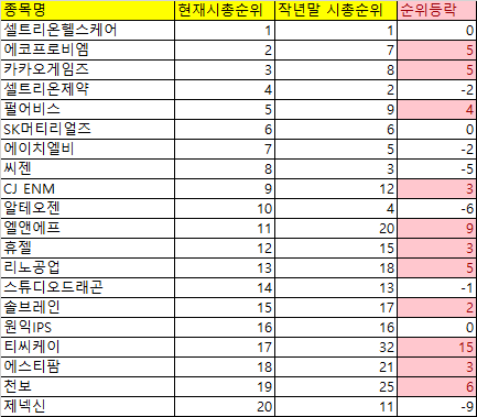 [ 현재 코스닥 시총 최상위 20종목의 작년 연말 대비 시가총액 순위 변화 ]