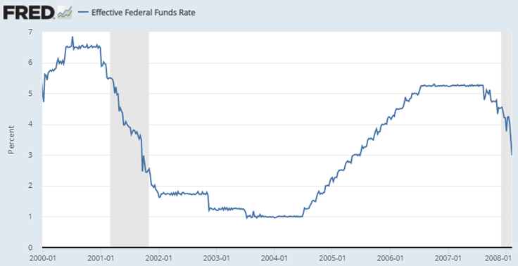 당시 미국은 2000년 초반 IT버블 붕괴, 2001년 911테러, 2002~03년 테러와의 전쟁과 이라크전쟁이라는 삼재와도 같은 크나큰 경제 불안 상황이 발생하였고 급기야 당시 그린스펀 의장은 당시로서는 상상하기 어려운 기준금리 1% 수준까지 낮추고 2013년 중반부터 2014년 6월까지 만 1년 가까이 초저금리 상태를 유지합니다.
