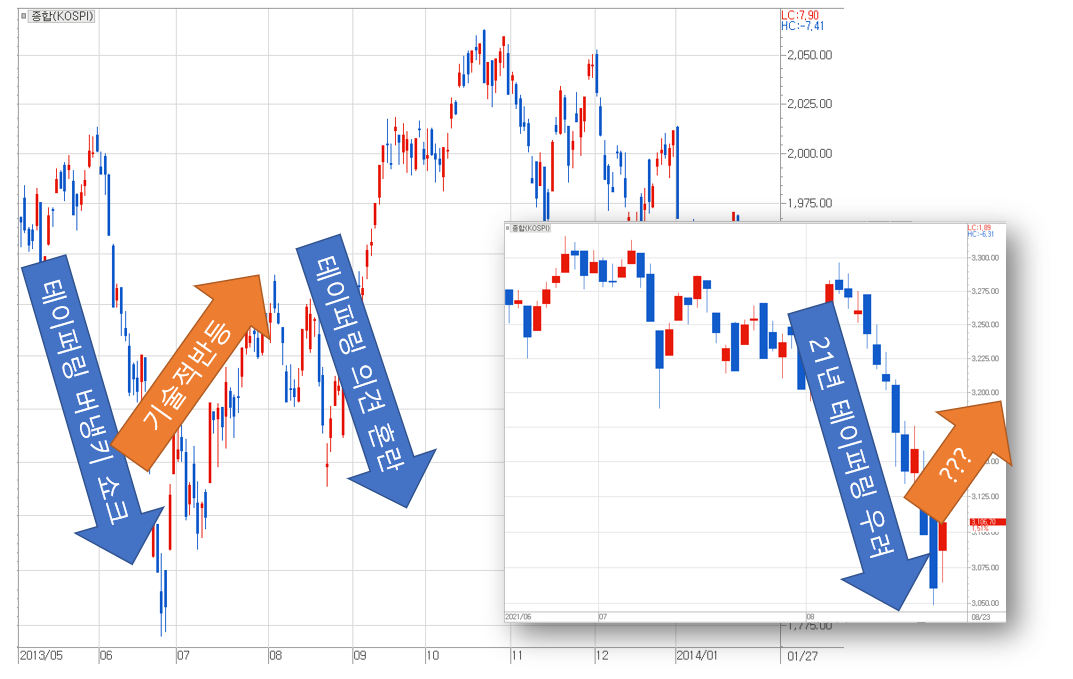[ 우측 차트 : 2021년 여름장 주가지수, 좌측 차트 : 2013년 버냉키 쇼크 이후 주가지수 ]