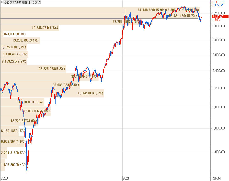 특히나, 이번 8월 조정장이 발생한 주가지수 3,000p~3,200p 영역은 아래 매물대 차트에서 보시는 것처럼, 지난 1월 이후 시장에 매물이 누적된 구간이기도 합니다.