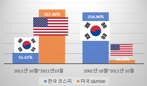 그런데, 그 이전 10년 (2001년 10월~2011년 10월)은 한국증시가 254.96%, 미국 증시가 18.26% 상승하였습니다. 마치 지난 10년과 그 이전 10년을 뒤 데칼코마니처럼 바꾸어 놓은 듯한 느낌입니다.