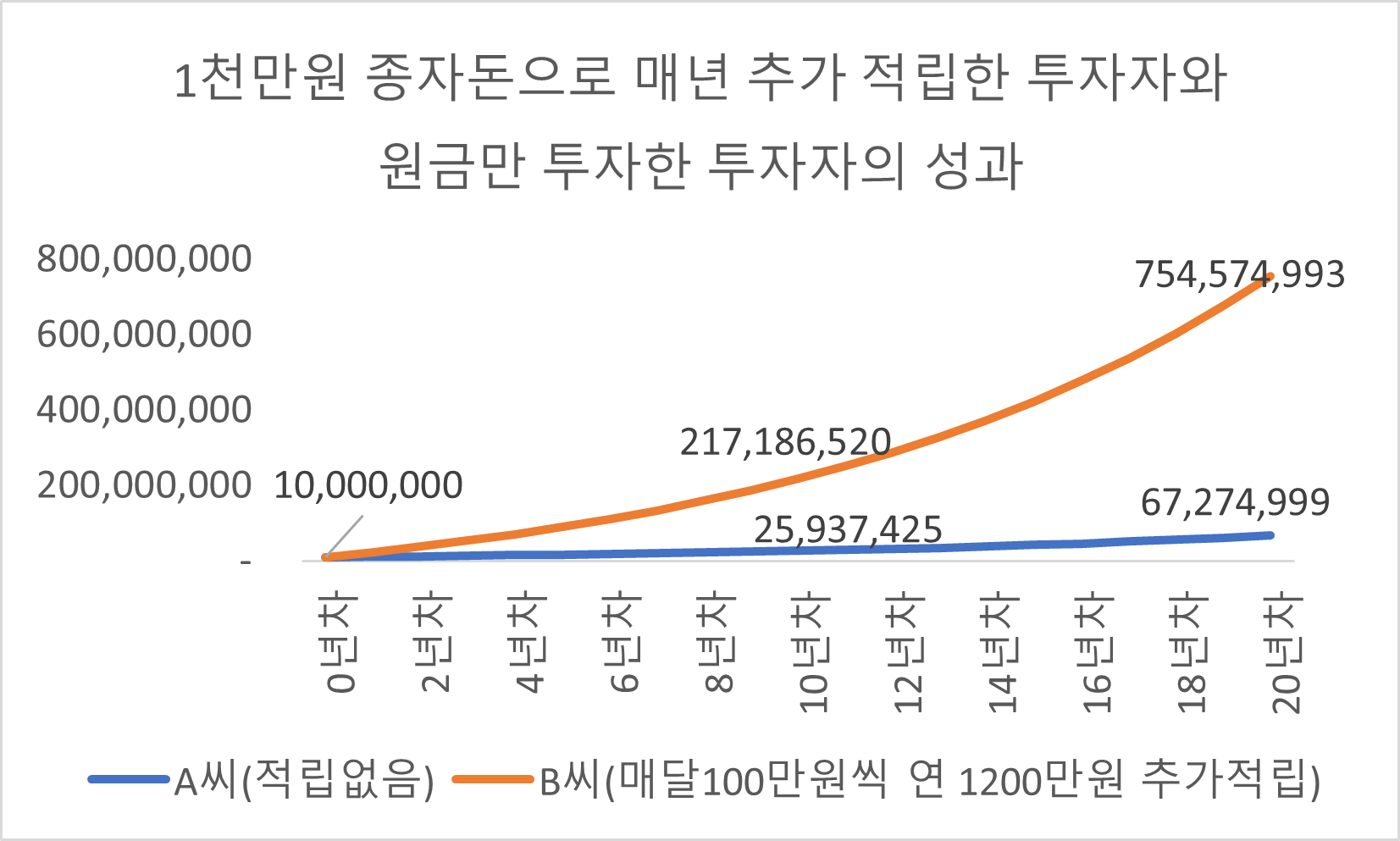 [ 1천만 원 종잣돈으로 꾸준히 적립한 투자자와 원금만 투자한 투자자의 투자 결과 차이]