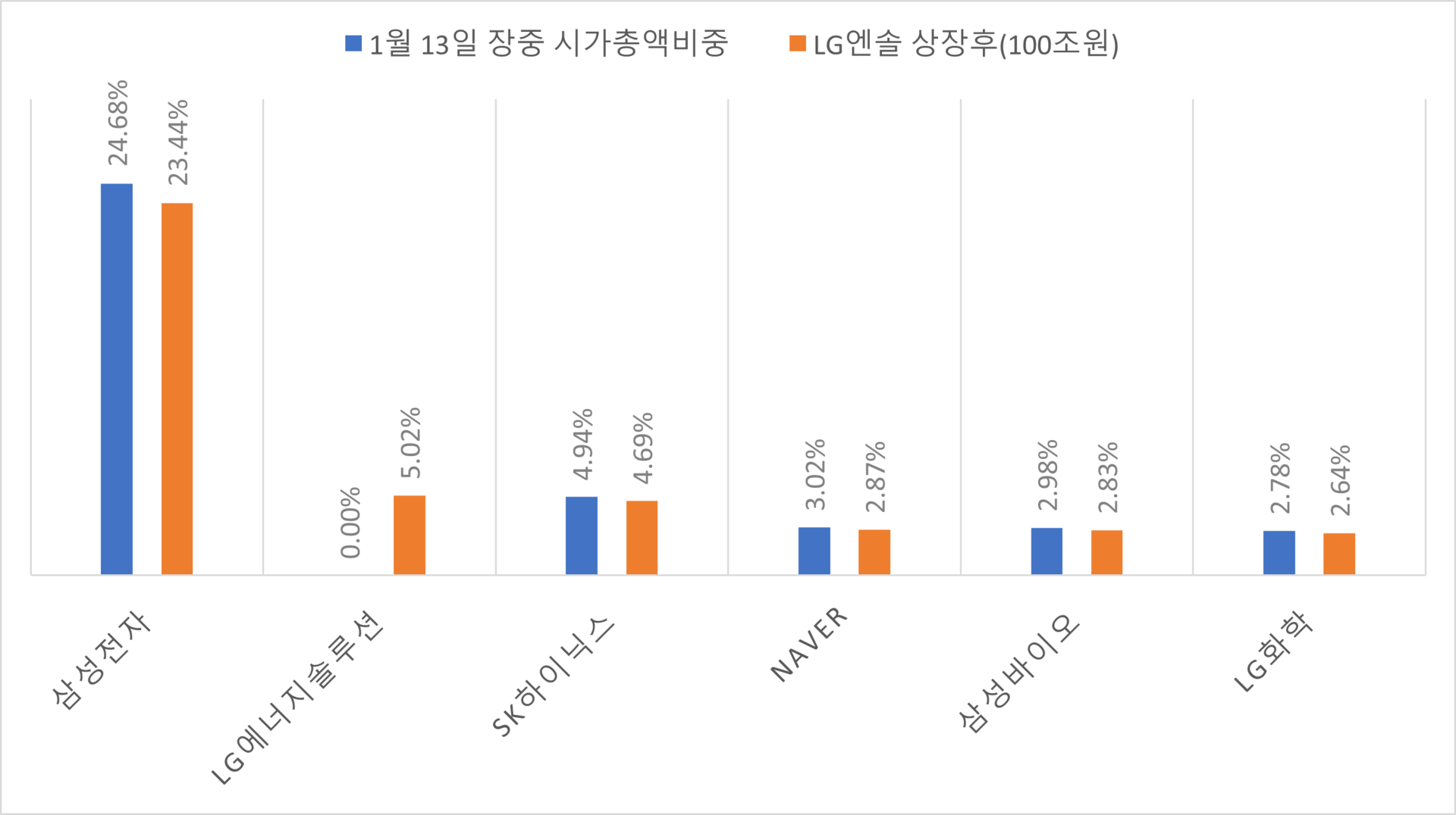 [ LG엔솔 상장 후 시가총액 비중은 크게 틀어진다. 1월 13일 기준. 계산 : lovefund이성수 ]