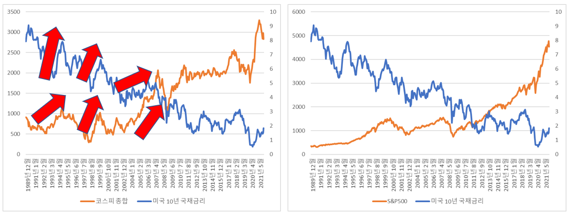 위의 그림은 1990년부터 최근까지 미국 10년 국채 금리 추이와 한국 코스피 지수 그리고 미국 S&P500 지수를 함께 표시한 자료입니다.