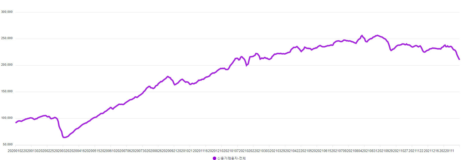 그리고, 2022년 1월을 보낸 지금 신용융자는 21조 원까지 내려오면서 작년 여름과 가을 수준에서는 20% 정도 감소하였습니다.