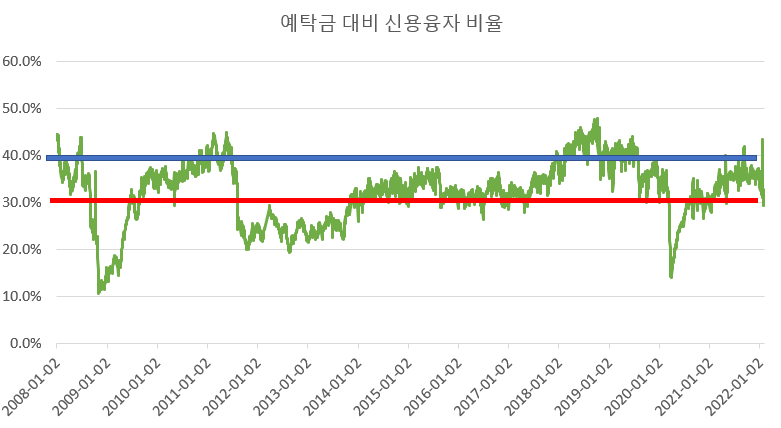 [ 예탁금 대비 신용융자 비율 추이, 2008년~2022년 2월 4일 자료 분석 : lovefund이성수 ]