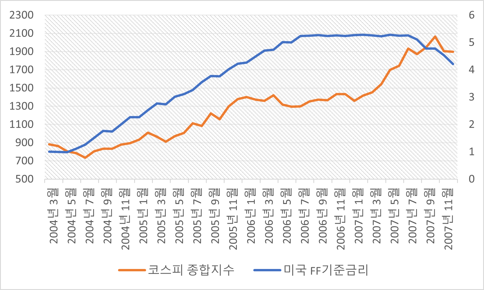 [ 미국 FF 기준금리와 당시 한국 코스피 종합지수, 2004년 3월~ 07년 12월 ]