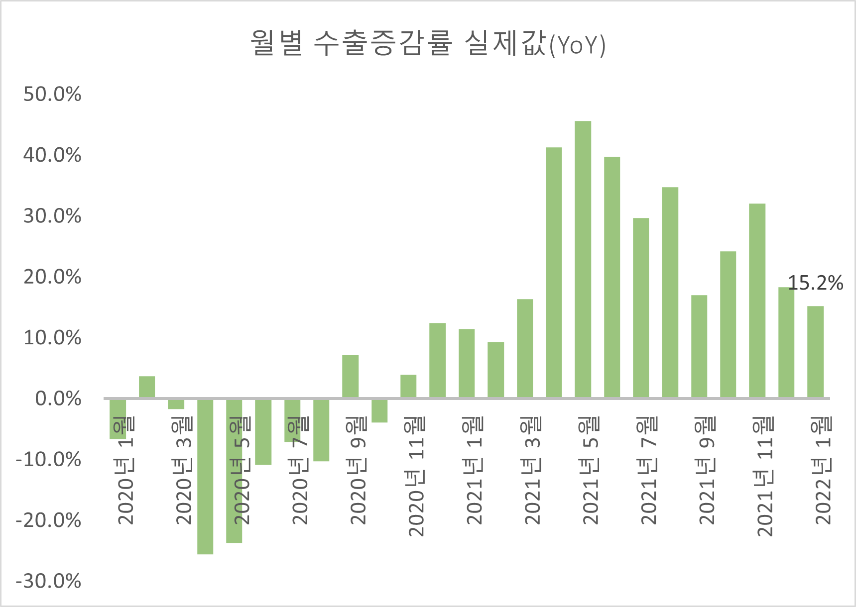 작년 하반기 이후 기저효과 약화가 예상되었지만, 오히려 수출 전년 비 실적은 매우 양호하였고, 올해 1월에도 그 분위기는 이어졌습니다. 553.16억$로 전년 동기비 15.2% 한국 1월 수출은 증가를 기록하였습니다.