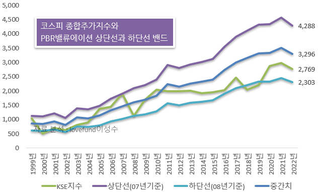[ 코스피의 주가지수와 PBR 밴드 추이, 자료 분석 : lovefund이성수 ]