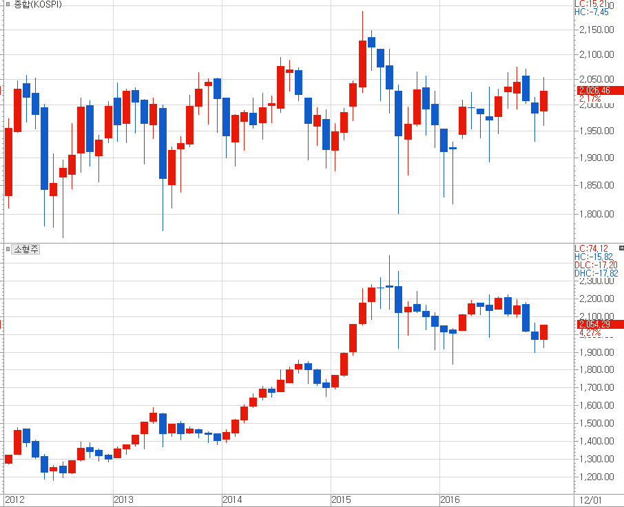 [ 2012~2016년 당시 코스피 지수 보합 장 불구, 코스피 소형업종 지수는 강세 ]