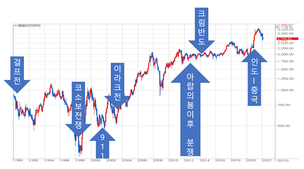 [ 90년대 이후 주요 전쟁들과 코스피 종합주가지수 ]