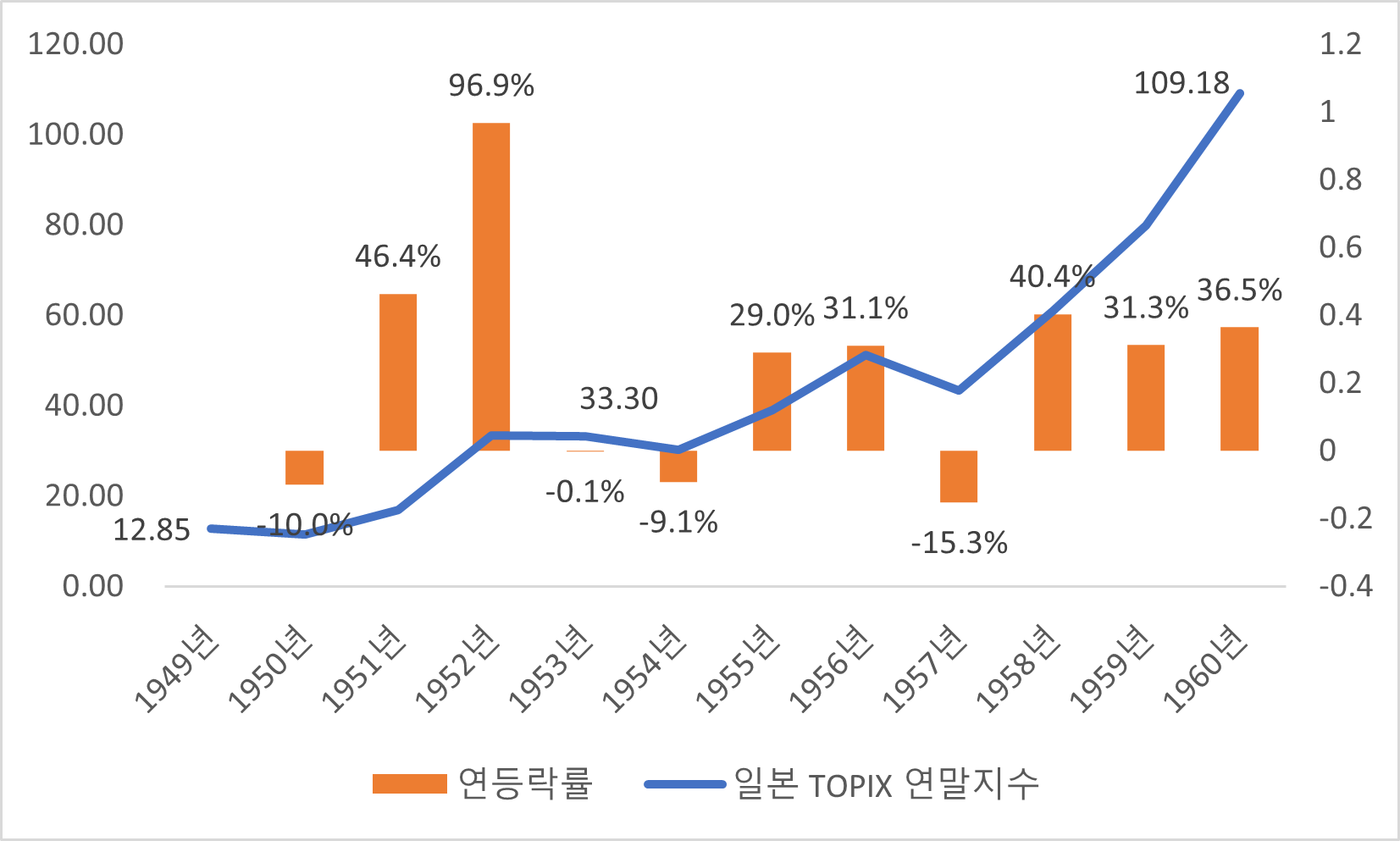 [ 한국 전쟁 전후 일본 TOPIX 지수 추이, 자료 참조 : 동경 증권 거래소 ]