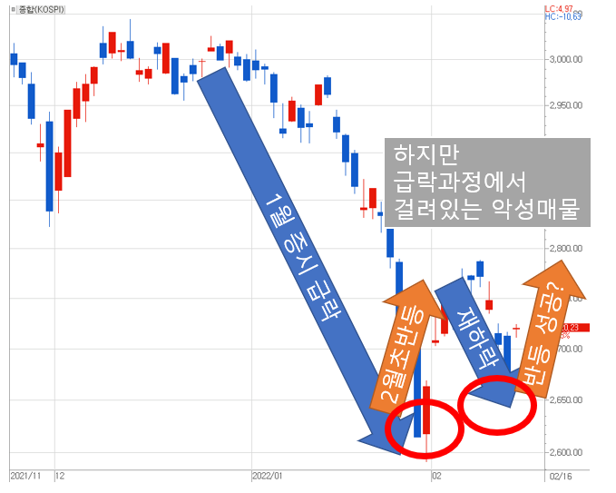 1월 하락장이 급하게 전개되다 보니 “어? 어?”하는 사이 물린 매물들이 켜켜이 쌓여있고 그러다 보니 이를 쌍 바닥만으로 넘어서기에는 매물 부담이 상당할 수도 있습니다.