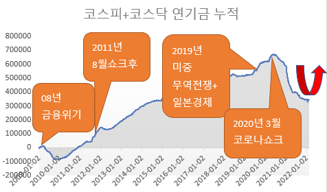 [ 코스피+코스닥 연기금 누적 순매매 추이, 2009년 연초~2022년 2월 15일 ]