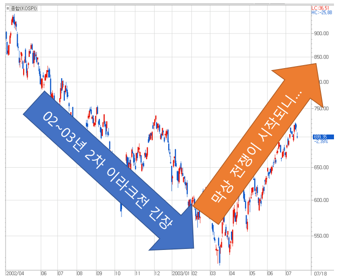 하지만, 막상 2003년 3월 이라크전쟁이 발발한 뒤, CNN 뉴스 속보에 포화가 가득 찬 이후 증시는 언제 그랬냐는 듯 더는 지정학적 리스크에 반응하지 않고 되레 상승하기 시작하였습니다. 2003년~ 2007년 초 강세장의 시작 시점이 아이러니하게도 이라크전 D-day 날이 되었던 것입니다.