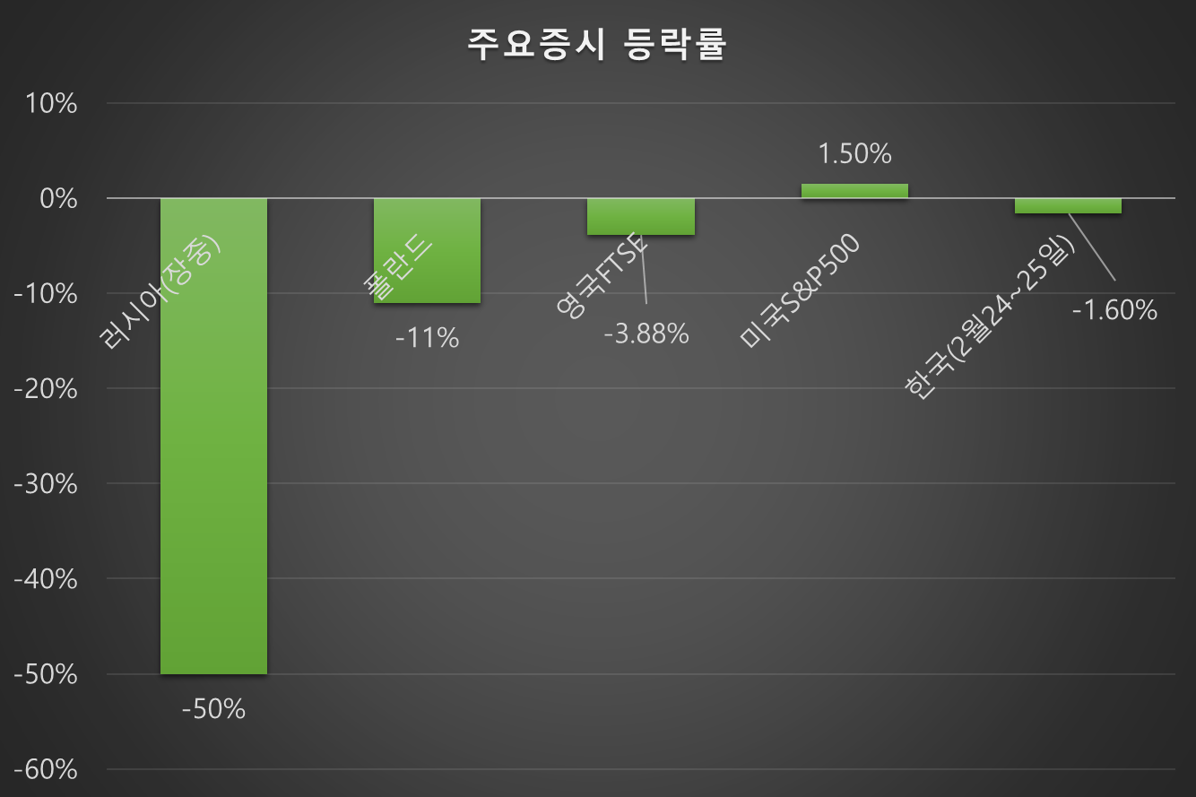 [ 우크라이나로의 러시아 침공이후 주요 국가들의 증시 등락률 ]