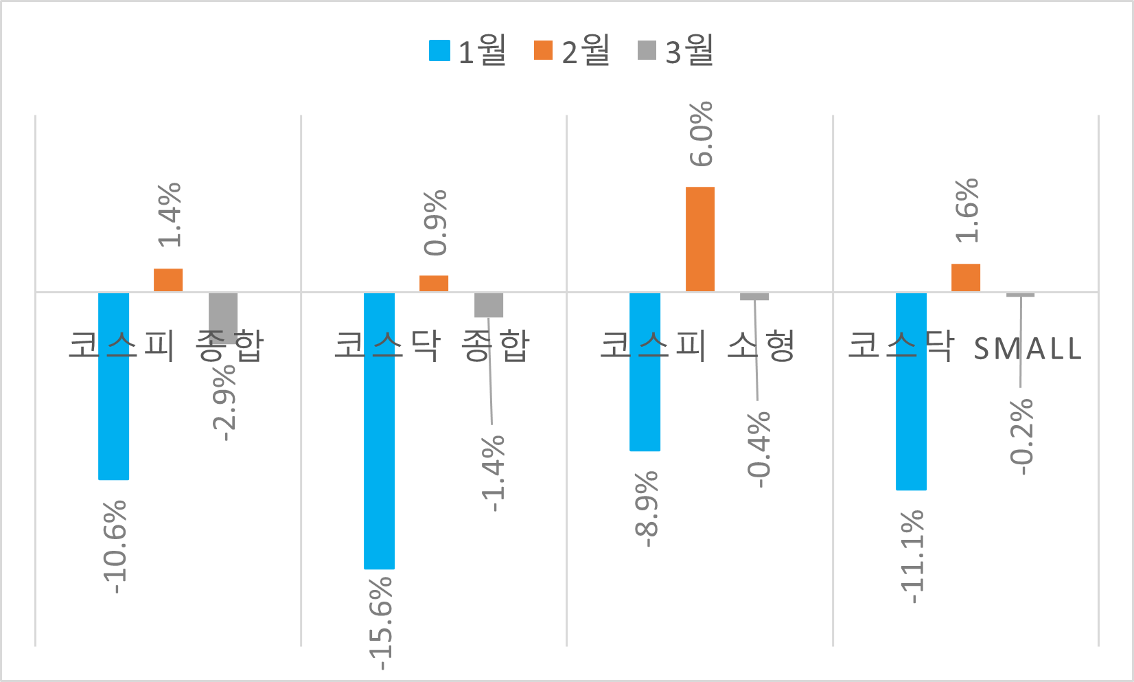 물론 1월에 낙폭이 컸던 부분은 아쉽긴 합니다만, 2월과 3월 증시 분위기가 대폭락에 빠진 듯한 체감지수와는 달리 상대적으로 탄탄합니다.