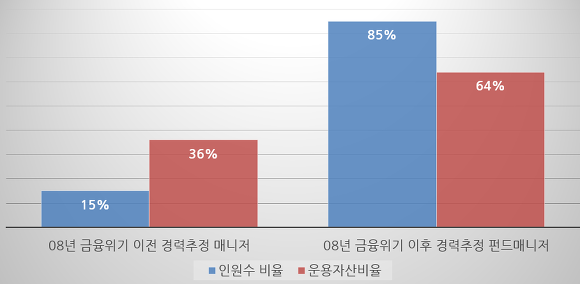 그러다 보니 당시 펀드매니저 중에서도 십중팔구는 대폭락 장을 경험한 적이 없던 상황이었습니다. 당시 필자가 금융투자협회의 운용인력에 관한 통계를 분석하여보니 85%의 펀드매니저가 08년 금융위기 이후 경력을 쌓은 펀드매니저였습니다. 십중팔구가 2008년 금융위기는 책으로만 보았던 것이었지요. 그리고 2011년 8월 중급하락장 쇼크를 경험하지 않은 비율 또한 75%에 이르렀습니다.
