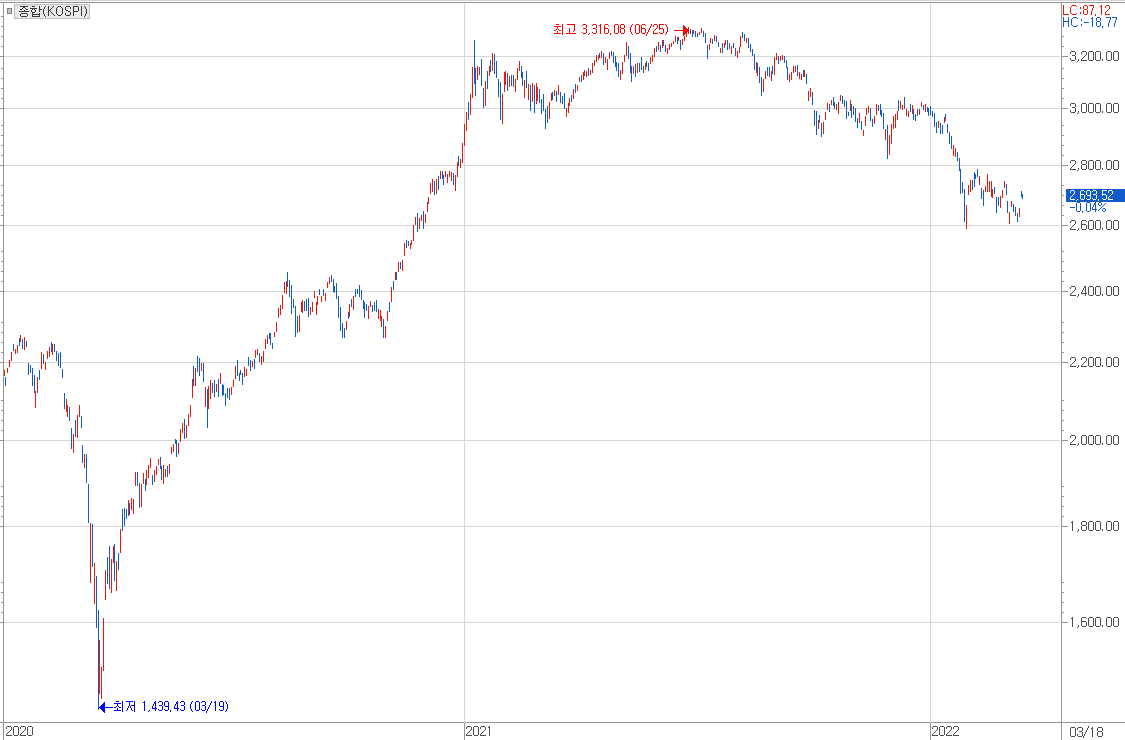 벌써 2년이 흘렀습니다. 2020년 3월 코로나 쇼크로 인해 3월 중순 급락 양상이 전개되면서 대폭락 장이 기록되었던 때가 2년 전 즈음입니다. 그 급락장은 3월 18일에는 주가지수 1,600p를 붕괴시켰고 2020년 3월 19일 종합주가지수는 1,439p를 찍었습니다.