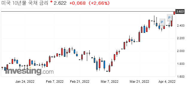 올해 들어 인플레이션 상황이 통제 불능 지경에 들어가고, 연준의 매파적 발언과 결정들이 쏟아지면서 시장 금리는 강하게 치솟고 있습니다. 미국 10년 국채 금리는 지난달 말 2.345%에서 어젯밤 2.61%로 마감하였으니 단 며칠 만에 26bp(0.26%P) 이상 높아졌습니다.