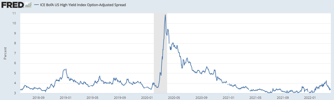 그런데 현재 위의 하이일드 스프레드는 3.33% 수준에 불과합니다. 아직은 고요하다고나 해야 할까요?