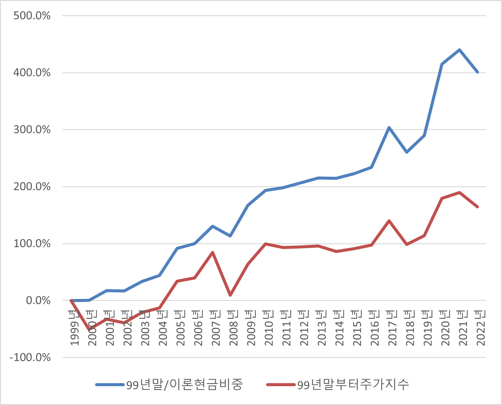 이를 활용하여 99년 IT버블 말부터 2022년 최근까지 종합주가지수와 배당수익률/예금 금리를 활용한 자산 배분 비율의 수익률 추이를 추적하여 보았습니다. 전체적으로 완만하지만, 꾸준히 높아지는 성과를 확인할 수 있었습니다.