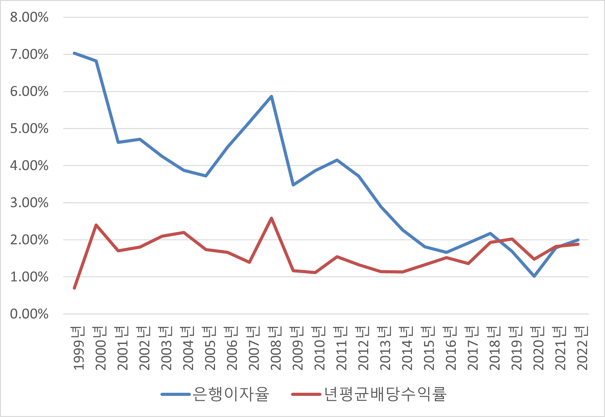 [ 1999년 이후 은행 1년 예금 금리와 1년 코스피 배당수익률 추이 ]