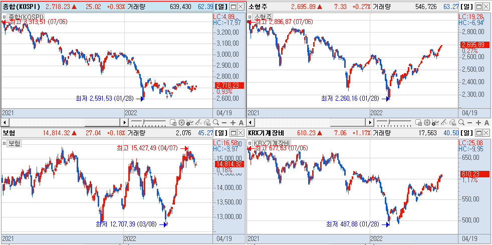 위의 차트는 코스피 종합주가지수(좌상)와 소형업종지수(우상), 보험업종(좌하) 그리고 KRX 기계장비업종(우하)을 보여주고 있습니다.