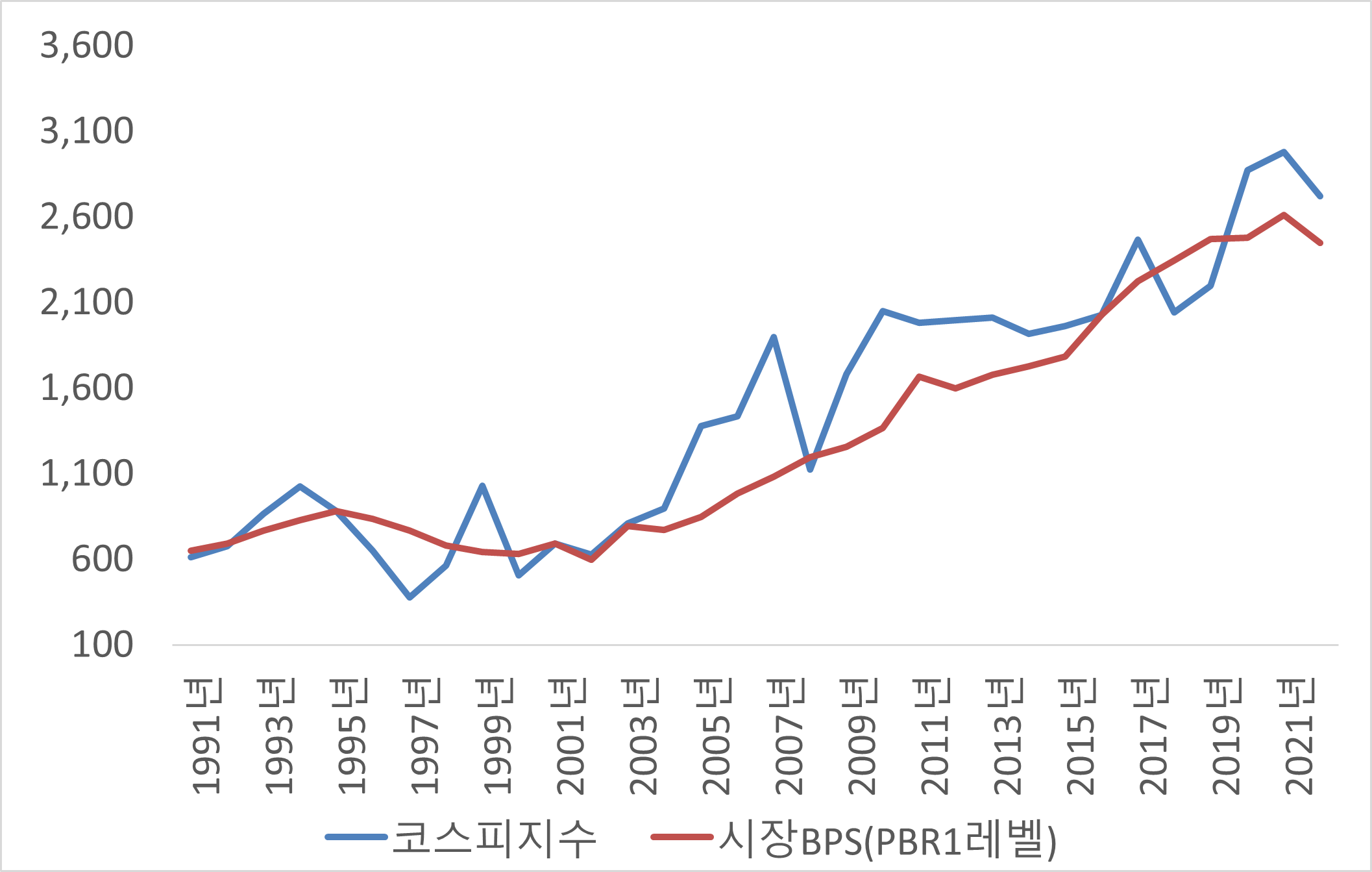 [ 코스피 지수와 시장 BPS 장기 추이 1991년부터 2022년 최근까지 ]