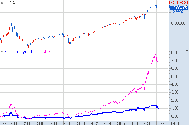 위의 차트는 나스닥 지수에 셀인메이 누적수익률 지표(청색선)와 나스닥 지수 수익률 지표(분홍색선)를 함께 적용한 차트입니다. 한눈에 보시더라도 추세가 강했던 나스닥 지수는 1998년 중반 이후 최근까지 630%가 넘는 엄청난 상승률을 기록하였습니다만, 셀인메이 전략은 100% 정도의 누적수익률을 기록하였을 뿐입니다.