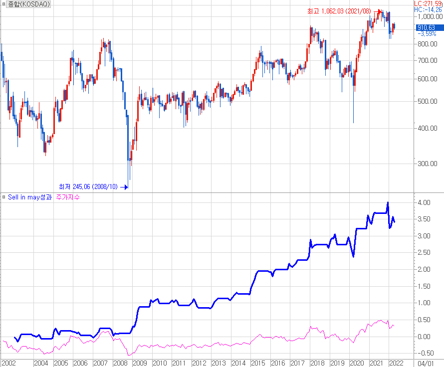위의 도표는 코스닥 시장에 Sell in May 전략(청색선)을 적용하였을 때의 누적수익률과 코스닥 지수(분홍색선)의 누적수익률을 2002년 5월부터 최근까지 비교한 차트입니다.