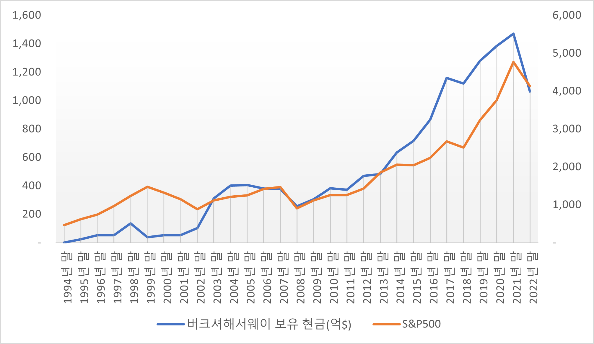 [ 버크셔의 현금 보유 규모 추이와 S&P500지수 추이, 자료 참조 : 버크셔해서웨이 홈페이지 ]