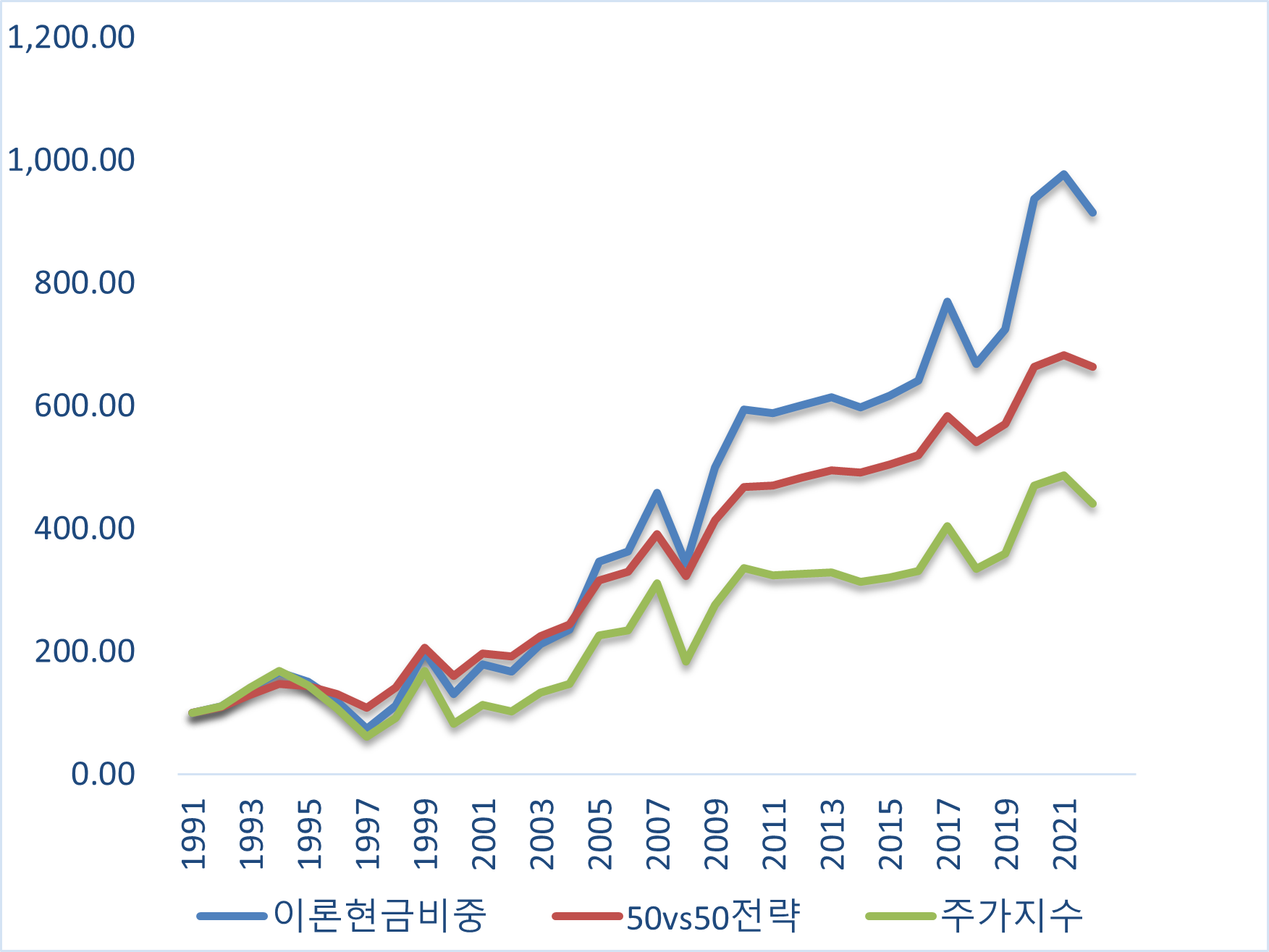 바로, 시장이 뜨거워지면 조금씩 주식을 팔아 현금을 늘려가고 시장이 침체를 걷고 있으면 조금씩 주식을 사들여 가는 것이지요.