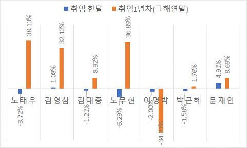 [ 직선제 대통령 취임 한 달 그리고 1년 차(연말까지) 코스피 등락률 ]