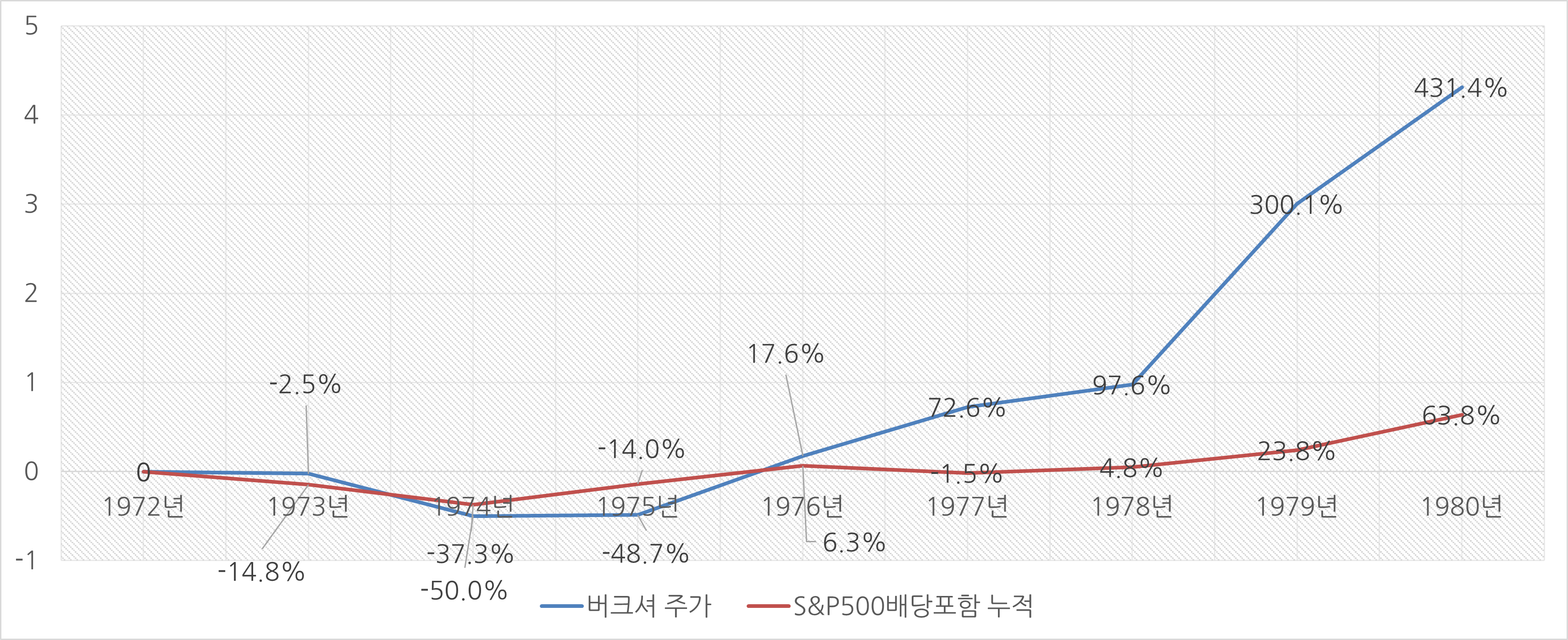 [ 1972년부터 1980년까지 버크셔 해서웨이 주가 수익률과 S&P500 총투자 수익률 ]