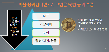 이번 고물가-금리 인상(긴축)으로 인하여 NFT, 코인, 꿈만 있던 성장주, 미국 주식 등의 거품 붕괴가 계속 이어져 큰 하락이 발생한다면, 이 과정에서 멀쩡한 다른 자산도 일부 영향을 받을 가능성도 있습니다.