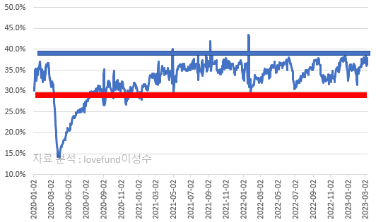 빚투 자금은 증시 상승기에는 주식시장에 에너지를 공급하여주지만, 임계치라 할 수 있는 예탁금 대비 신용융자 비율이 40%를 넘기는 수준에서는 오히려 외부 이슈에 악성 매물을 연쇄적으로 쏟아내는 원인이 되고 맙니다.