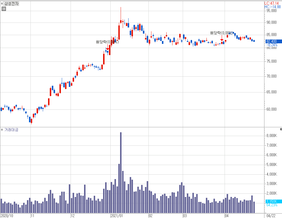 2020년 동학개미 운동 이후에 투자자들은 초대형 우량주에 관한 관심이 커졌고 그 중심에는 당시 삼성전자와 현대차가 있었습니다. 특히나 2020년 연말 외국인들이 뒤늦게 순매수를 시작하면서 시총 대형주를 매수하면서 삼성전자 등의 대형주 주가가 급등하고 주가지수는 결국 2021년 1월 3,000p를 넘겼었지요. 그리고 2021년 1월 11일 당시 삼성전자는 평소 거래대금에 거의 8배에 이르는 거래대금이 폭발하였습니다.