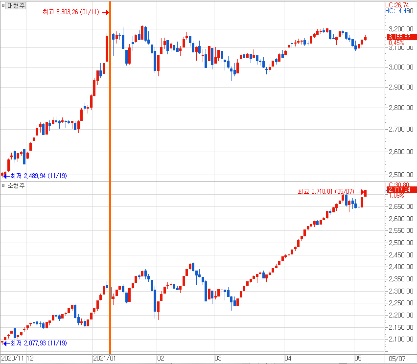 [ 2021년 1월 11일 거래대금 폭발 이후의 대형업종 지수 흐름과 소형업종 지수 흐름 ]